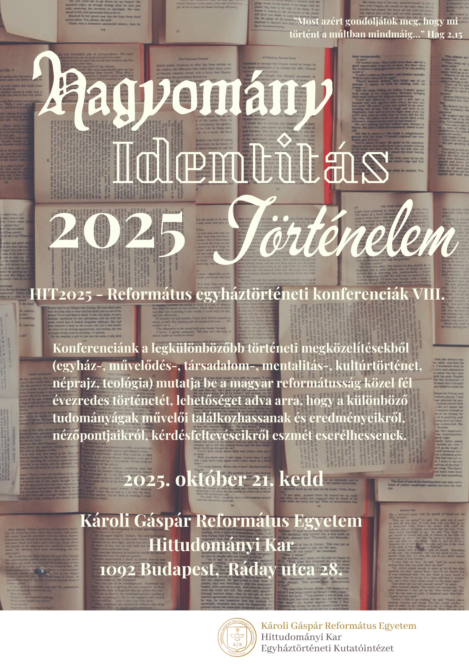 A Károli Gáspár Református Egyetem Hittudományi Karának Egyháztörténeti Kutatóintézete 2025. október 21-én (kedden) HAGYOMÁNY, IDENTITÁS, TÖRTÉNELEM VIII. (HIT2025) címmel egyház- és művelődéstörténeti tudományos konferenciát szervez a kar épületében (1092 Budapest, Ráday u. 28.).