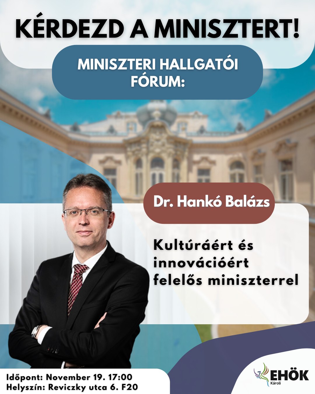 November 19-én – egyetemjáró körútjának következő állomásaként – a Károlira látogat Hankó Balázs kultúráért és innovációért felelős miniszter.